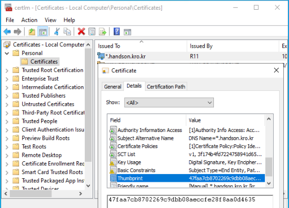 적용하려는 인증서 더블 클릭 후 Details 탭으로 이동하여 Thumbprint 필드 까지 스크롤 후 값 확인 합니다.