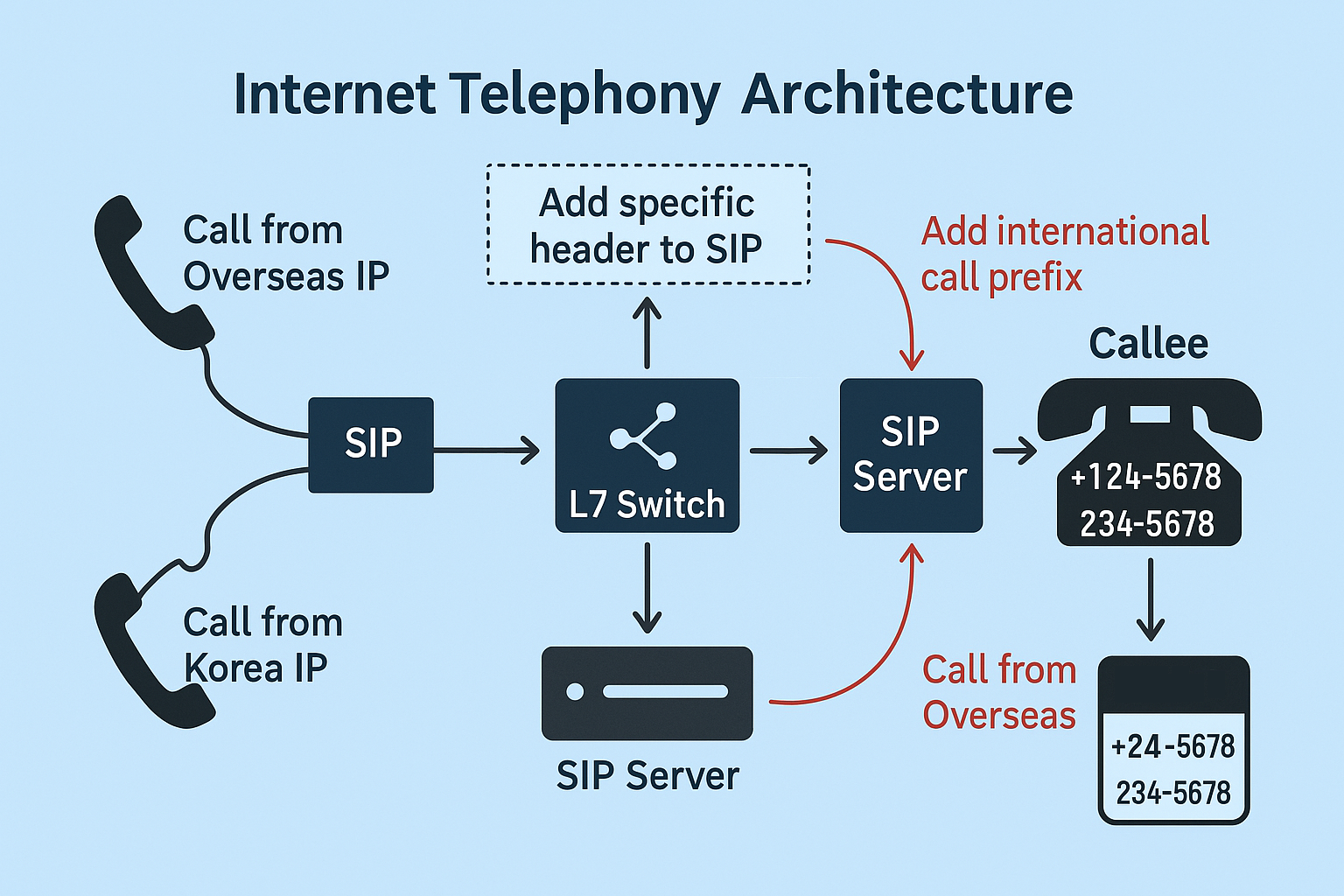 그러나, 발신단말의 IP는 발신단말 → 교환기에서만 확인 가능하니, 해당 구간에서 확인해야만 했습니다. 그래서 해당 구간의 장비에서 해외 발신 호 인지 아닌지 확인 후 착신 시까지 전달해야 했습니다.