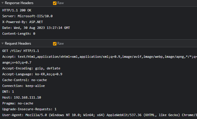 하지만 파일명 없이 http GET을 하면 200 OK 가 나오지만, 해당 폴더에 Default Document 가 없으니 빈 화면만 표시된다.