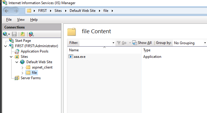 IIS 에 Site 를 만들고, 문서 최상위 폴더 아래 다운로드 될 파일이 있는 file 이라는 폴더를 추가하고, 해당 폴더에 aaa.exe 라는 파일을 한개 추가 하였다.