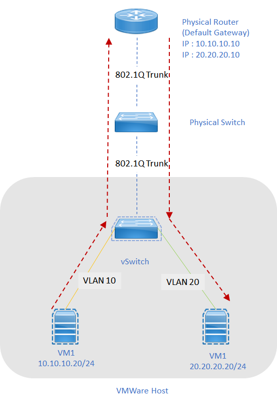 vSphere 상 의 서로다른 VLAN 간 통신을 위해서는 2가지 방법이 있습니다.
